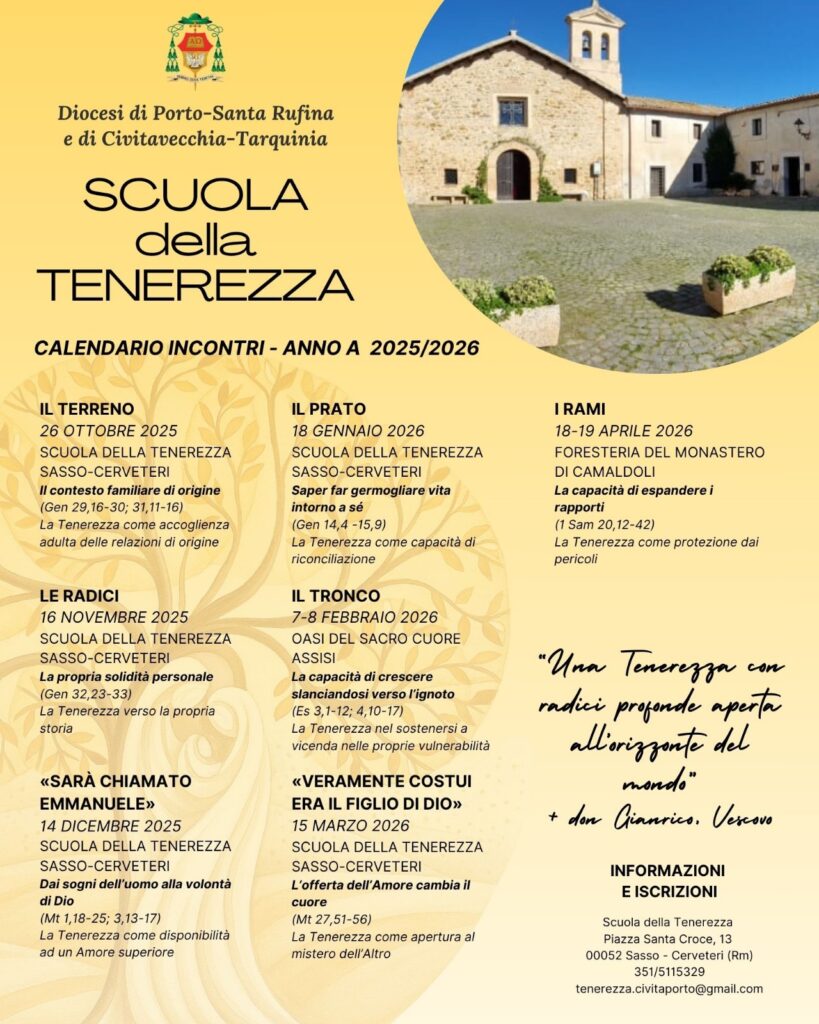 Il 26 ottobre riparte la Scuola della tenerezza presso il Borgo della tenerezza. La Scuola, ispirata dalla teologia della Tenerezza di don Carlo Rocchetta e dall’intuizione del vescovo Gianrico Ruzza, è un percorso di formazione nato nel 2022 nelle diocesi di Civitavecchia-Tarquinia e di Porto e Santa Rufina. Destinata a coppie, fidanzati, giovani e giovanissimi, la scuola propone di crescere insieme nello stile della Tenerezza, a partire dall’incontro con Dio-Tenerezza.