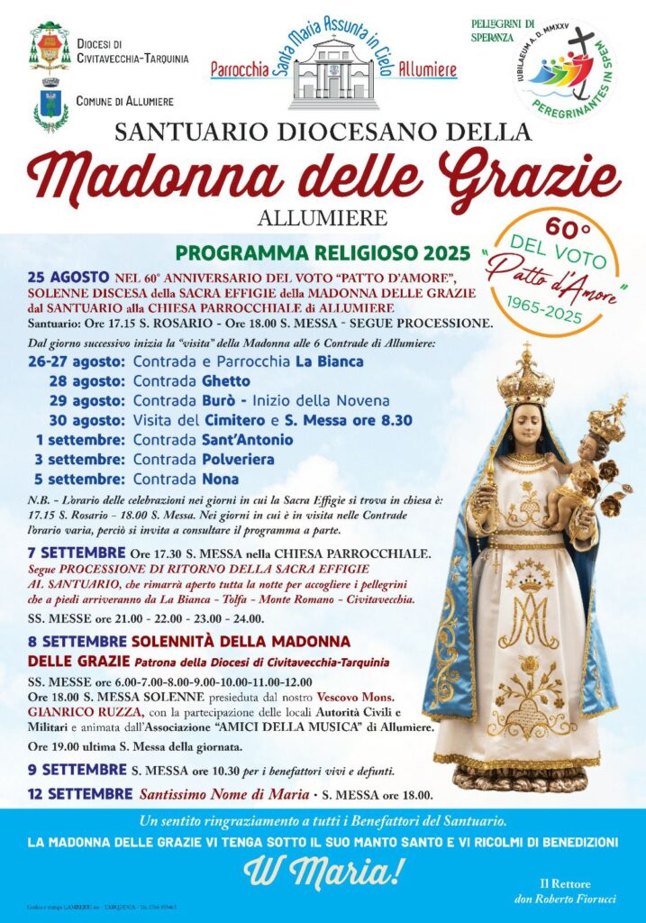 Parrocchie 7 Settembre 2025 admindiocesi Madonna delle Grazie patrona della diocesi. Festa al santuario di Allumiere lunedì 8 Settembre Descrizione: Inizio: 08/09/2025 01:00 Fine: 08/09/2025 23:00 Categorie: Parrocchie Città: Civitavecchia Regione: Lazio Paese: Italia FacebookTwitterPinterestemailLinkedin madonna_grazie